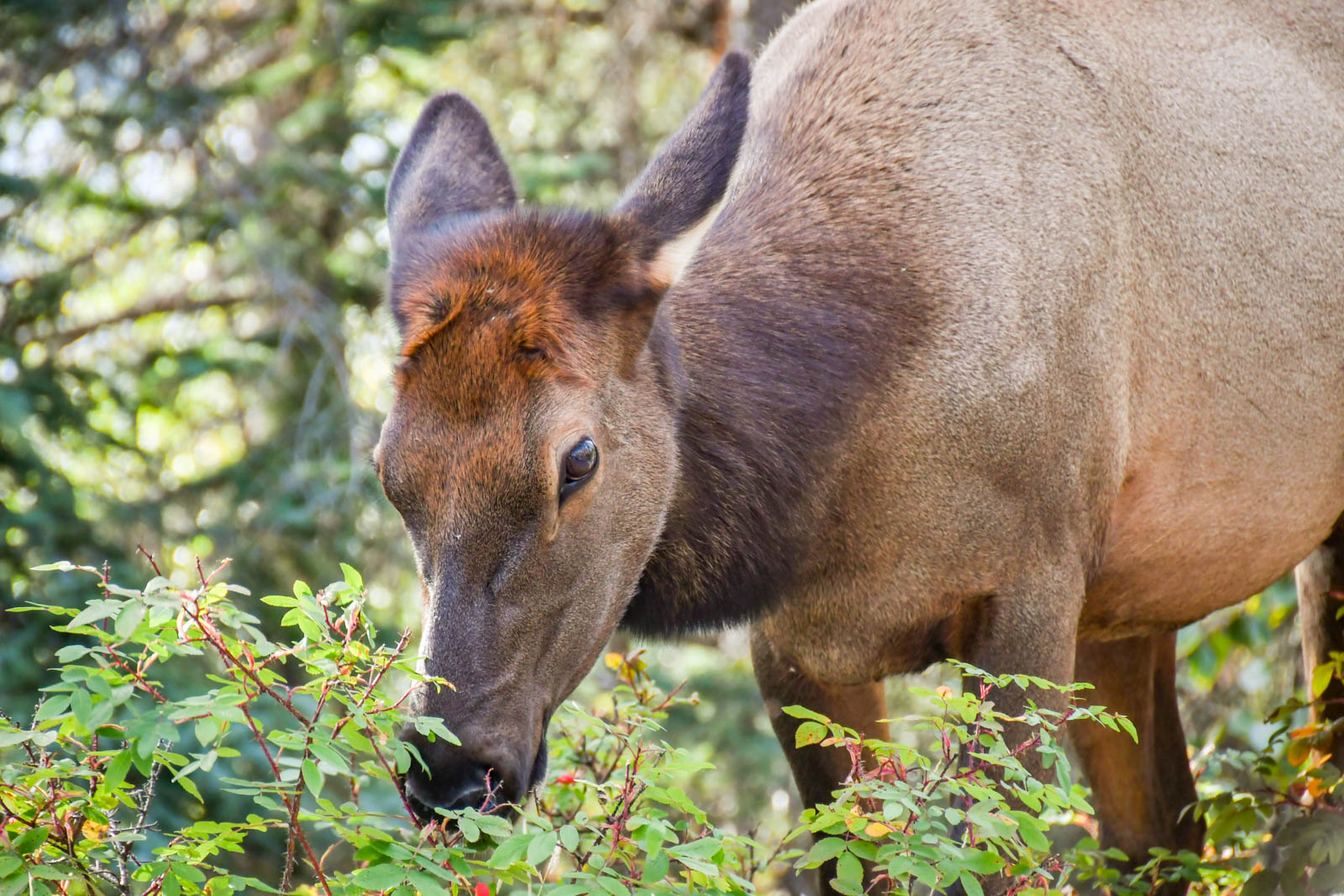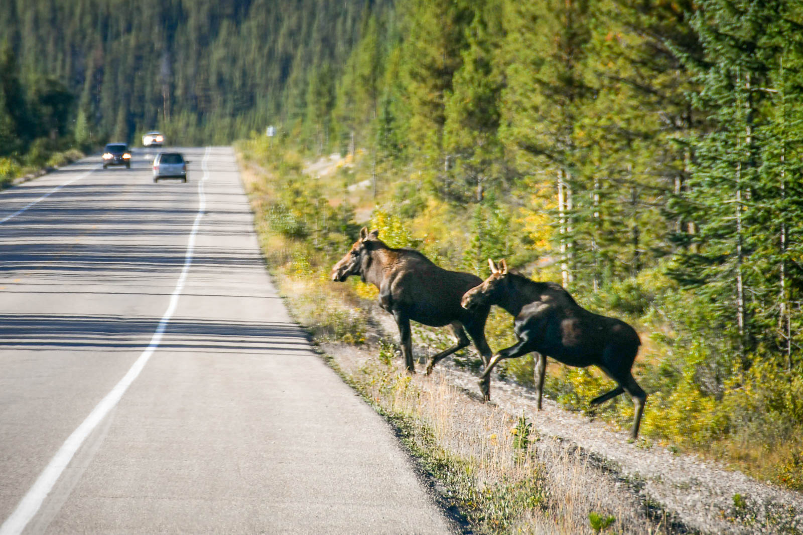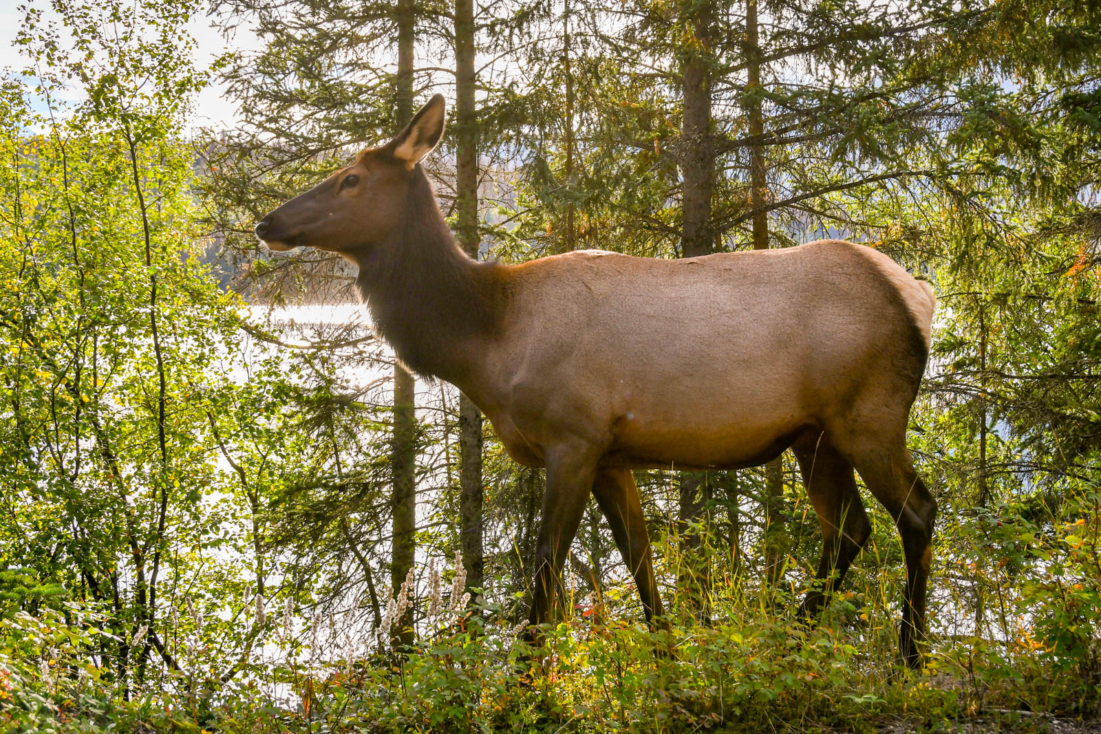 Op weg naar Maligne lake kwamen we nog een grote eland-stier tegen die tussen de bomen stond. Wat zijn het toch magnifieke dieren. Bij Maligne lake nog enkele wandelingen gemaakt, variërend in lengte en hoogte. Het begon al wat donkerder te worden, en toen schoot er vlak voor ons ineens een mama-eland met kalf het pad op. We konden ze ruim een kwartier bekijken terwijl ze rustig aan het grasmaaien en snoeien waren. Als toetje nog wat herten bij de parkeerplaats. Je kunt uren door het bos lopen op zoek naar dieren, maar de beste plek blijft toch altijd binnen 200 meter van de parkeerplaats 😉