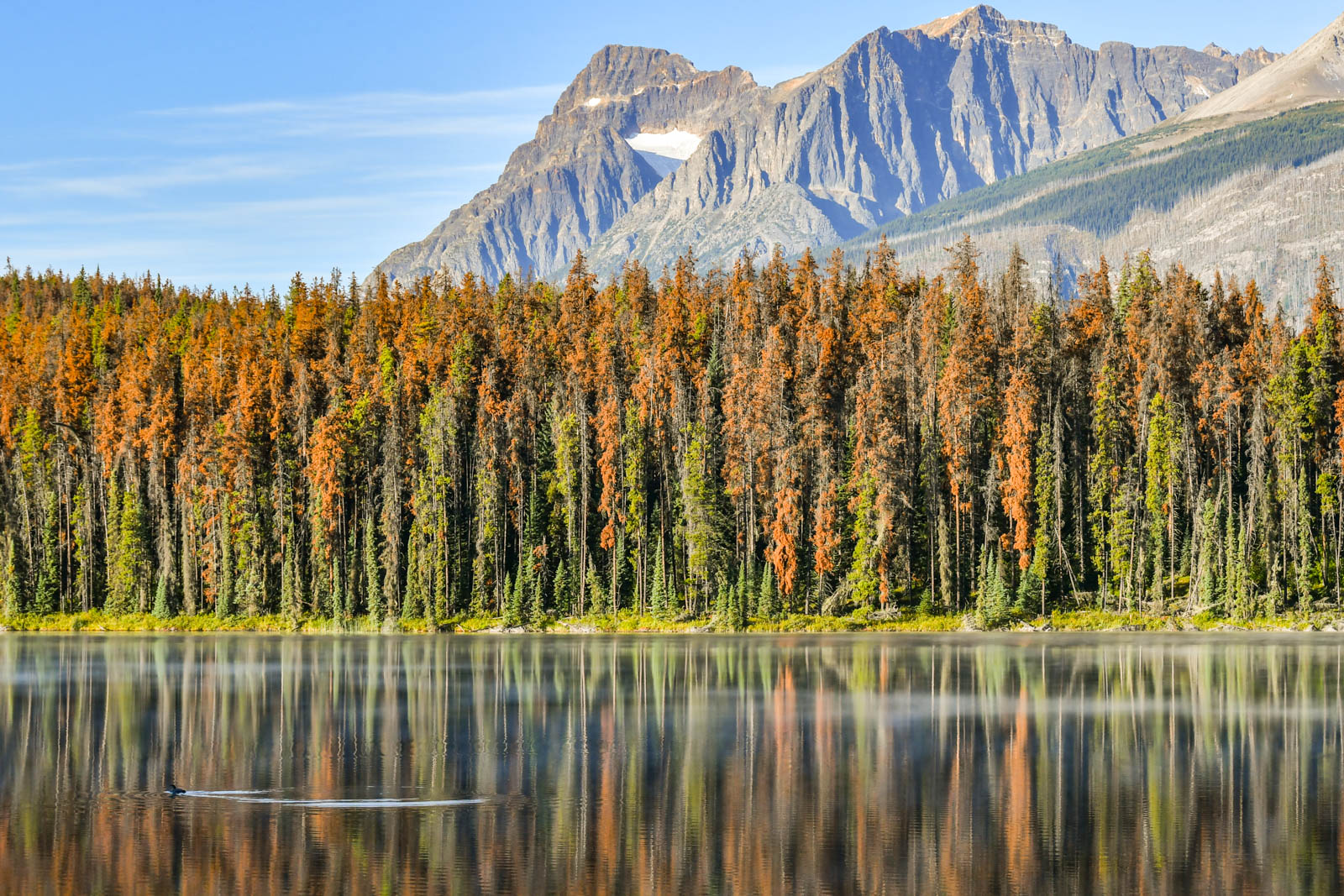 De volgende dag toch even gedag gezegd tegen de ons bekende plekken. Het was even wennen hoe alles veranderd is. De hellingen die eerst groen waren zijn nu groen met rood. Er staan veel dode bomen tussen. Aangevreten door een keversoort die indirect ook mede verantwoordelijk is voor de bosbranden. Dode bomen fikken beter. We schrokken ook van de aanblik van Medicine Lake. Daar is blijkbaar enkele jaren geleden een bosbrand geweest, en de helling staan nu bezaaid met afgebrande stompen in plaats van dennenbossen. Jasper lake was ook wat drukker, maar gelukkig stonden er nog steeds moeflons langs de weg te grazen.